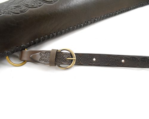 Wykonany w całości z naturalnej skóry przy czym przód kołczanu tworzy gruba (3,5mm.), garbowana roślinnie skóra bydlęca ozdobiona tłoczeniami celtyckimi.