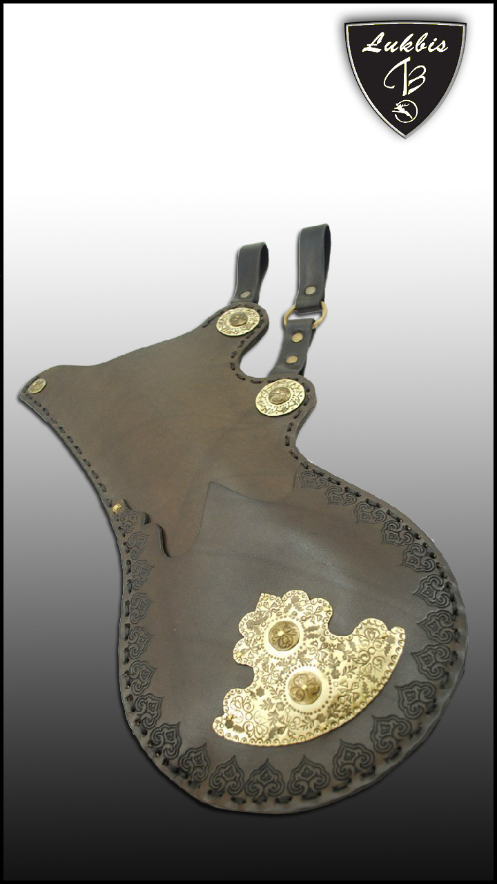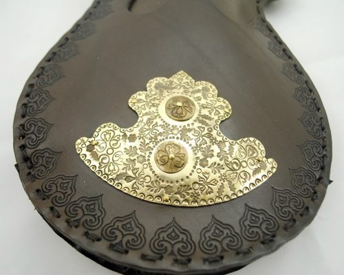 Zdobienia stanowią ręcznie puncowane blachy mosiężne o wschodniej ornamentyce oraz tłoczenia na obwodzie kołczanu.